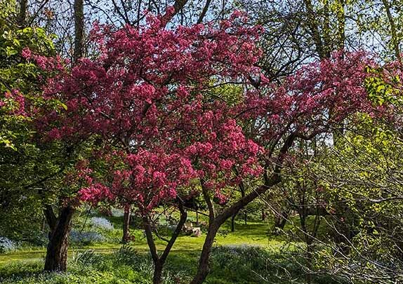 Flowers:In the bud state the flowers are of a delightful ruby red, becoming paler and more purple on opening fully. The stamens, calyx, and flower-stalk are also richly coloured. The flowers are in clusters of six or seven. Blooms in April and then may bloom a second or third time.