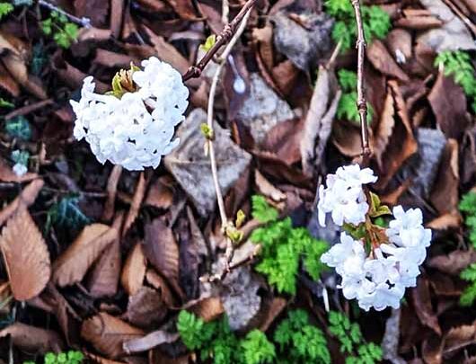 Flowers are white or with pinkish tints when they open, becoming more pink later on. Sweetly scented (from January), 16 mm in diameter, in 5 cm diameter cymes. These appear before the leaves open.