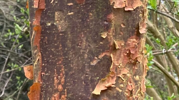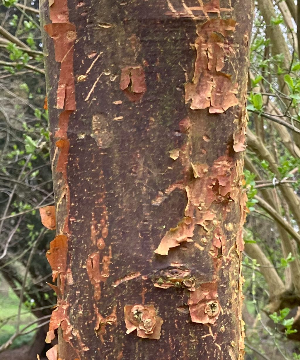 | Bark: | The bark is smooth, shiny orange red, peeling in thin, papery layers; it may become fissured in old trees. The shoots are densely downy at first, this wearing off by the second or third year and the bark exfoliating by the third or fourth year. |