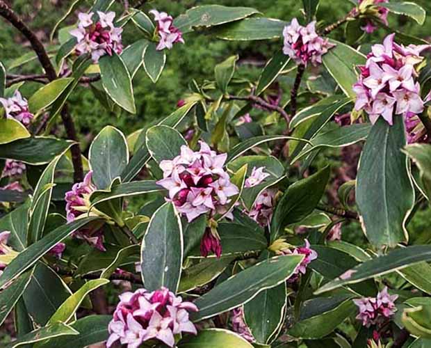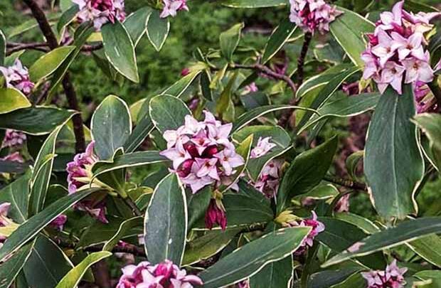 Daphne odora, winter daphne, is a native to China, later spread to Japan and Korea. It is an evergreen shrub, grown for its very fragrant, fleshy, pale-pink, tubular flowers, each with four spreading lobes, and for its glossy foliage It rarely fruits, producing red berries after flowering.