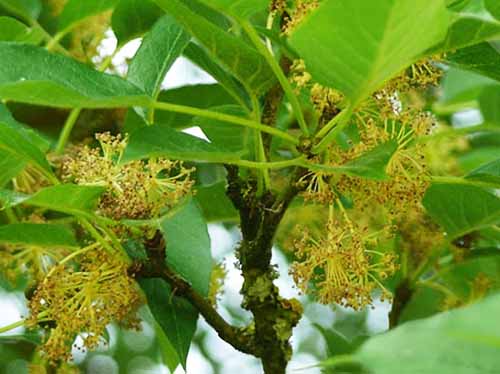 | Flowers: | Male and female flowers are on separate trees in little green/yellow round clusters. This is a male tree. |